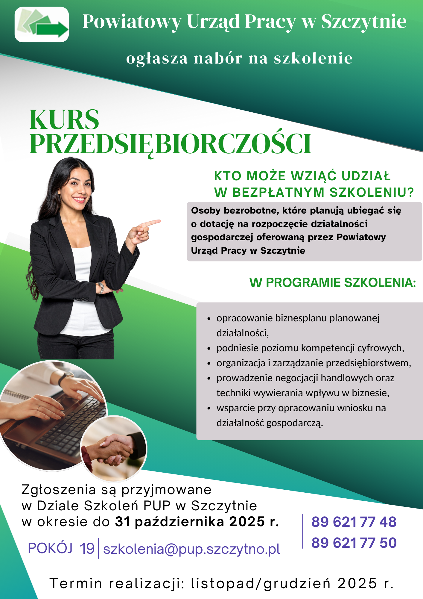- W programie szkolenia m.in.: opracowanie biznesplanu planowanej działalności, podniesienie poziomu kompetencji cyfrowych, prowadzenie negocjacji handlowych oraz wsparcie w opracowaniu wniosku na działalność gospodarczą.