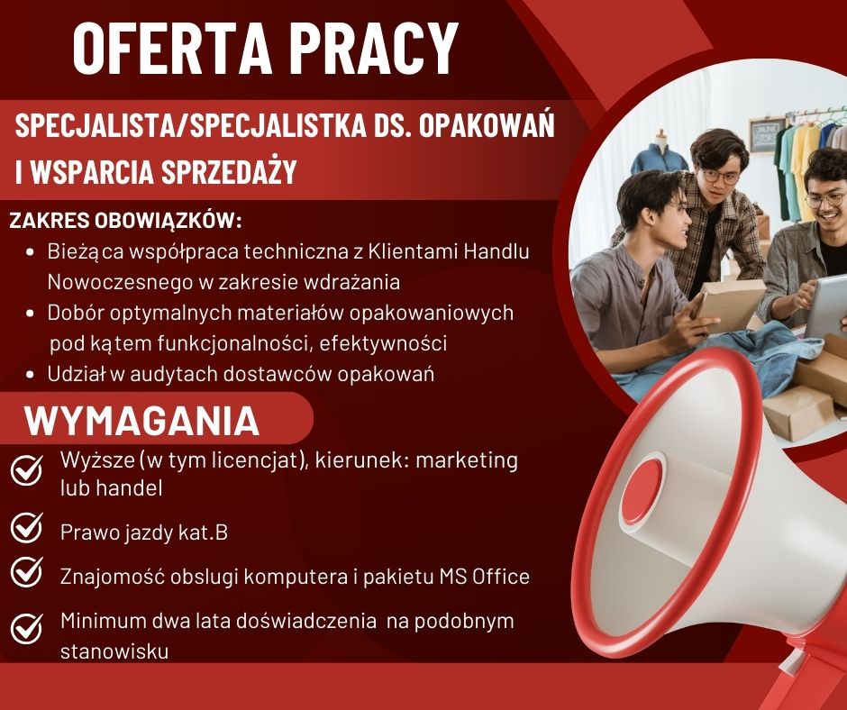 MAKARONY POLSKIE S.A. zatrudni Specjalistę ds. Opakowań (Korpele/Ząbki, pn.–pt.). Projektowanie i wdrażanie opakowań, współpraca z klientami. Wymagane wykształcenie wyższe i prawo jazdy kat. B....
